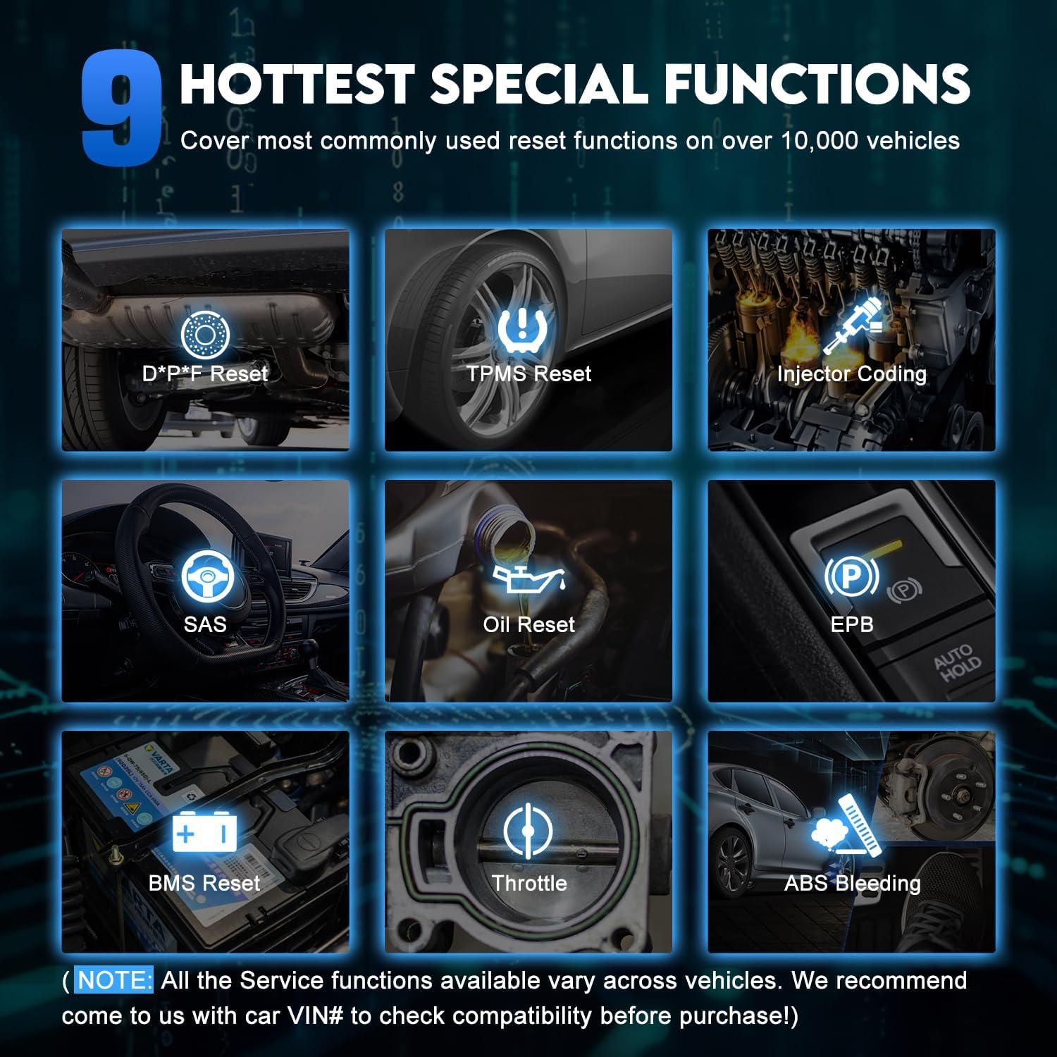 9 Reset Services, Most Cost-effective Diagnostic Tool for DIY Mechanics: Save money on repairs by using the IP508 to perform resets yourself. This tool pays for itself with functions like Oil Reset, EPB Reset, ABS Bleeding, Throttle Relearn, BMS Reset, SAS Reset, TPMS Reset, Injector Coding. Confirm compatibility by sending VINs/Functions before ordering