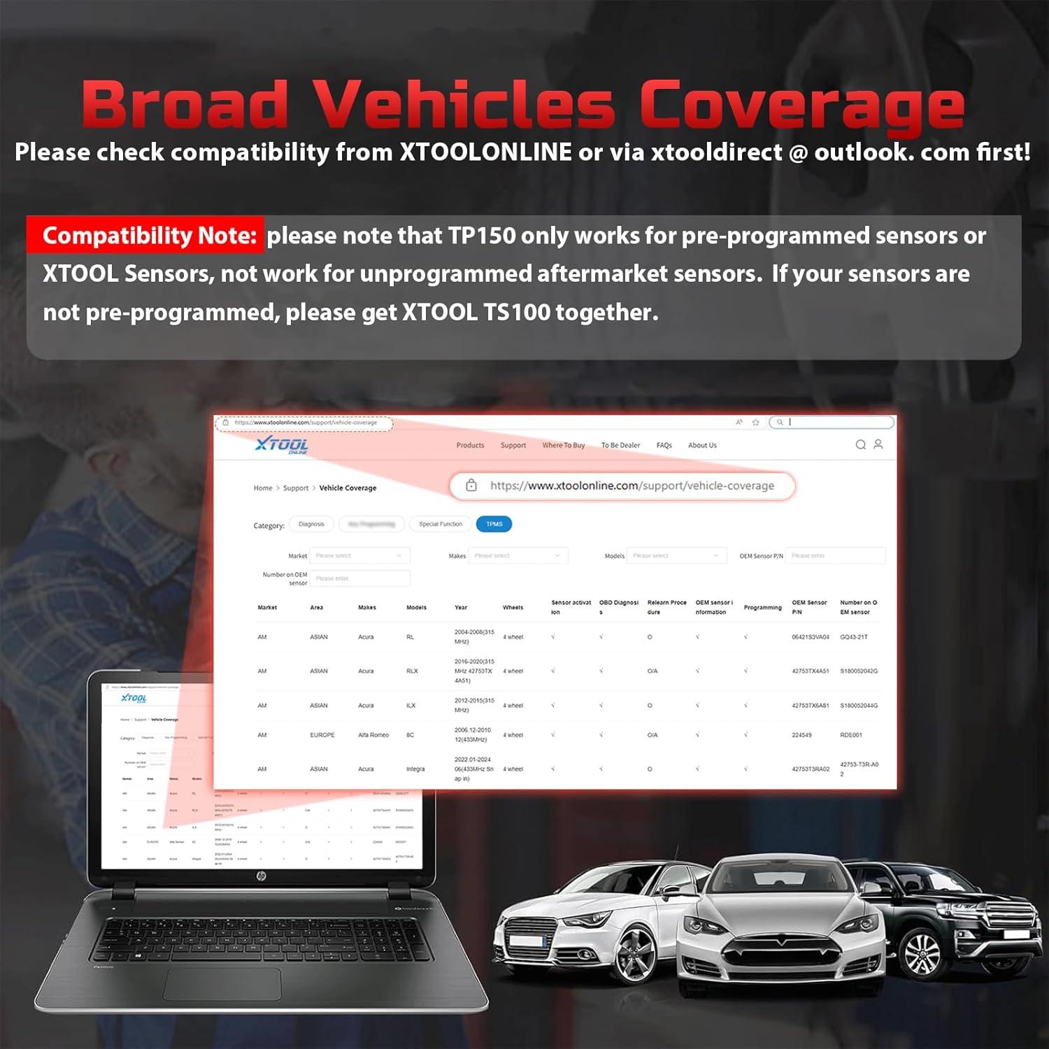 Compatibility Note: Need to program/activate/relearn/read sensors? Please note that XTOOL TP150 cannot work with unprogrammed OE or aftermarket sensors. It only works with pre-programmed sensors or XTOOL TS100 PRO sensors. For pre-programmed sensors, the part number should match the original OE sensors. If your sensors are not pre-programmed, then TP150 cannot work to program/activate/relearn/read, you will need both the TP150 and TS100 PRO. Sensor info like ID or battery can only be read after programming and activation. Please note this compatibility before purchase, any issue you can find XTOOL for help