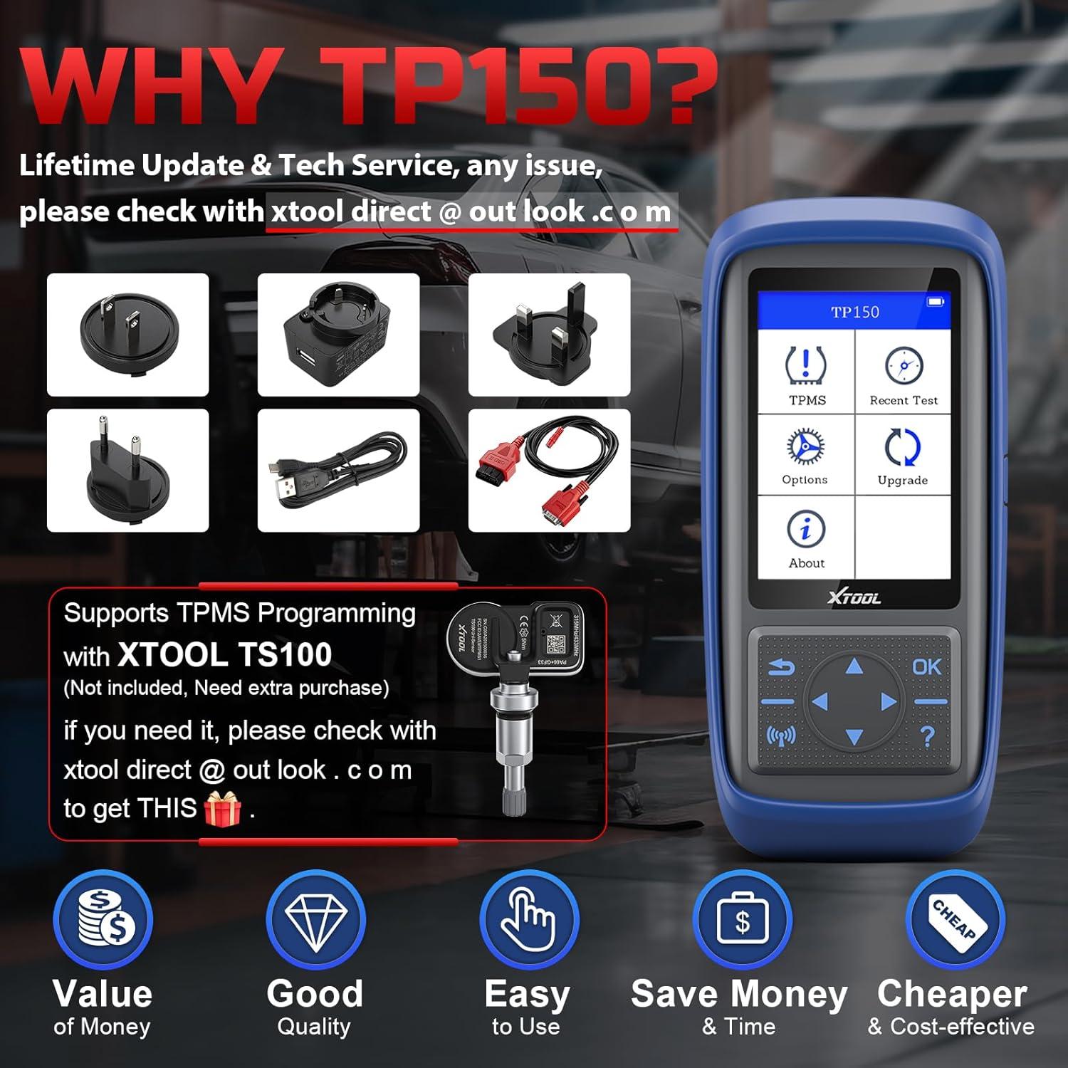 Professional One-stop TPMS Scan Tool with Top Full Services: Please note that it ONLY Works for programmed OE/aftermarket sensors or XTOOL Sensors. XTOOL TP150 is an affordable and portable TPMS relearn tool/activate tool, XTOOL TS100 PRO tps sensor programmer for almost all global vehicles. It also packs TPMS health diagnose, read real-time sensor info: sensor ID/tire pressure/temperature/battery life/frequency; check OE part number, diagnoses to read/clear DTCs and turn off annoying TPMS warning light after specific repairing, and also a cost-effective way to replace broken OE/aftermarket sensors, ensure a safe driving. Any issue, check with XTOOL for help